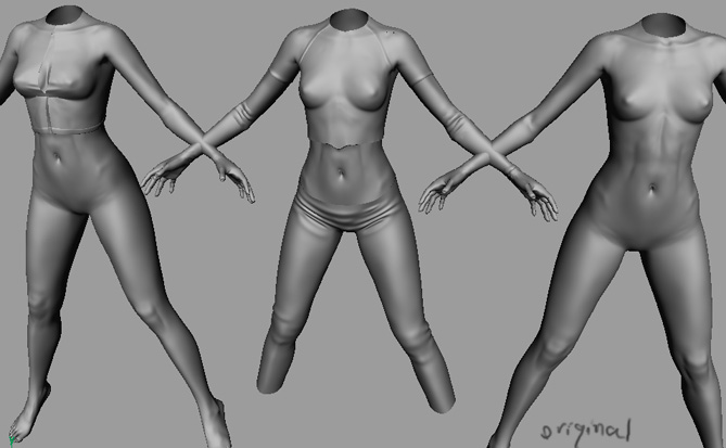 Here's a screencap showing 3 different bodies, 2 descendants created from the original. Since they all have exactly the same topology on the 0 level, they can all be animated using the same Wrap deformer, which means there is no rigging time at all needed to switch between these 3, simply un-Wrap and re-Wrap. The middle one is cut in 2 pieces, the seam is covered by a belt. The neck seams are covered by necklaces or collars.