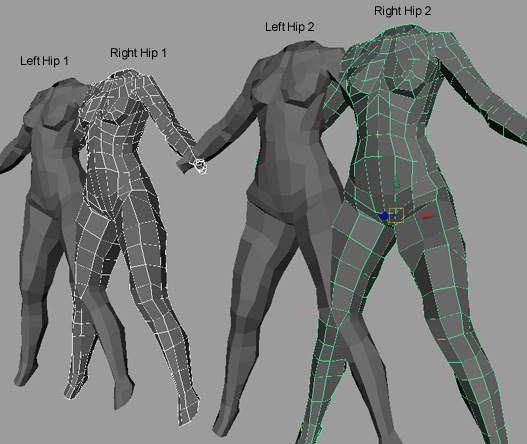 This shows how I lay out my Blendshapes - I overlap the ones that go together as a left-right pair, and place all for the same joint in the same row. In this example I'm using 3 consecutive targets for the knees.
