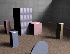Still ugly colors, but that's easily fixed, and otherwise it's much improved. Next we should improve the composition, by moving the foci around, by playing with the light, placement, camera angle, adding or removing objects etc. The strongest focus is off-center like it should be (upper edge of the biggest box), but almost too close to the edge. The second focus, the brightest part of the wall, is definitely too close to the edge, leading the eye right out. There's another focus near the lower right hand corner doing the same thing there. I'd suggest moving the blue disc to the right, and darkening the upper part of the wall. Other than that, the composition is okay.